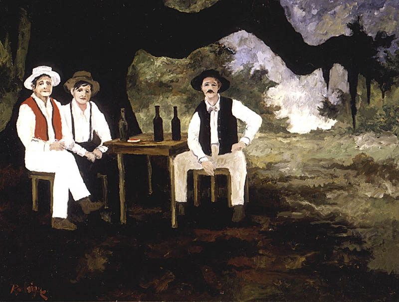 The closest I got to the beach on those trips was Mr. Glenn’s downtown diner, where I bussed tables most mornings. Aunt Lois’s old friend flipped omelets and burgers as he spit his chewing tobacco into the empty baked beans’ can tied around his neck. At twelve years old, I understood the resplendence of local characters; I played a mean game of cards; and I had change in my pocket. Life was good. (pictured, Playing Bourré, 1986, 30×40, oil on canvas)
