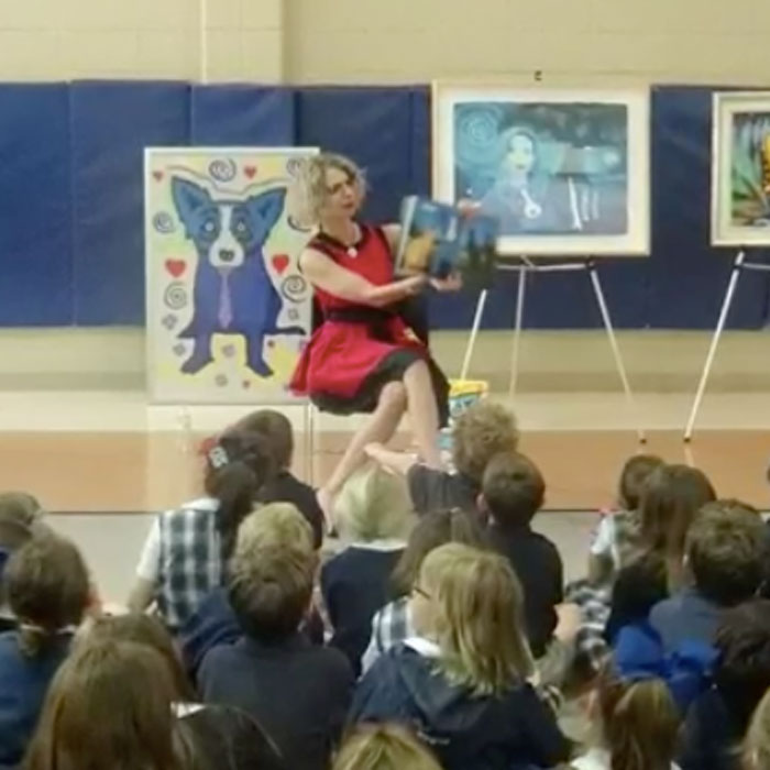 Wendy Rodrigue, wife of late ‘Blue Dog’ creator George Rodrigue, visits art students at Tioga Elementary